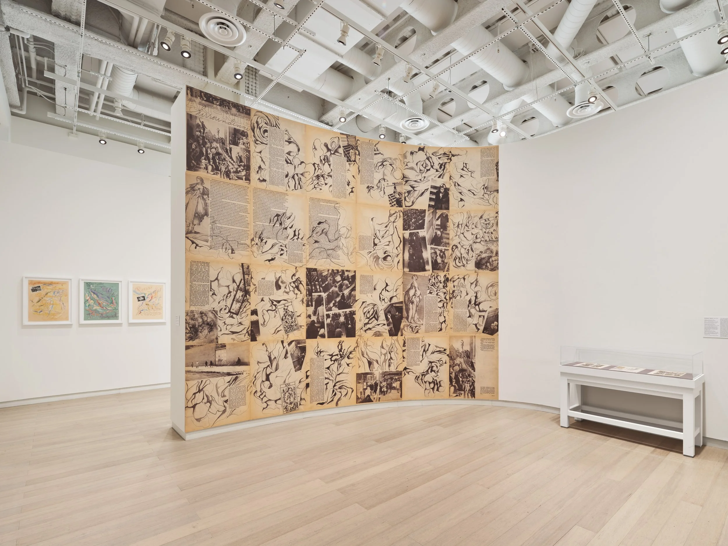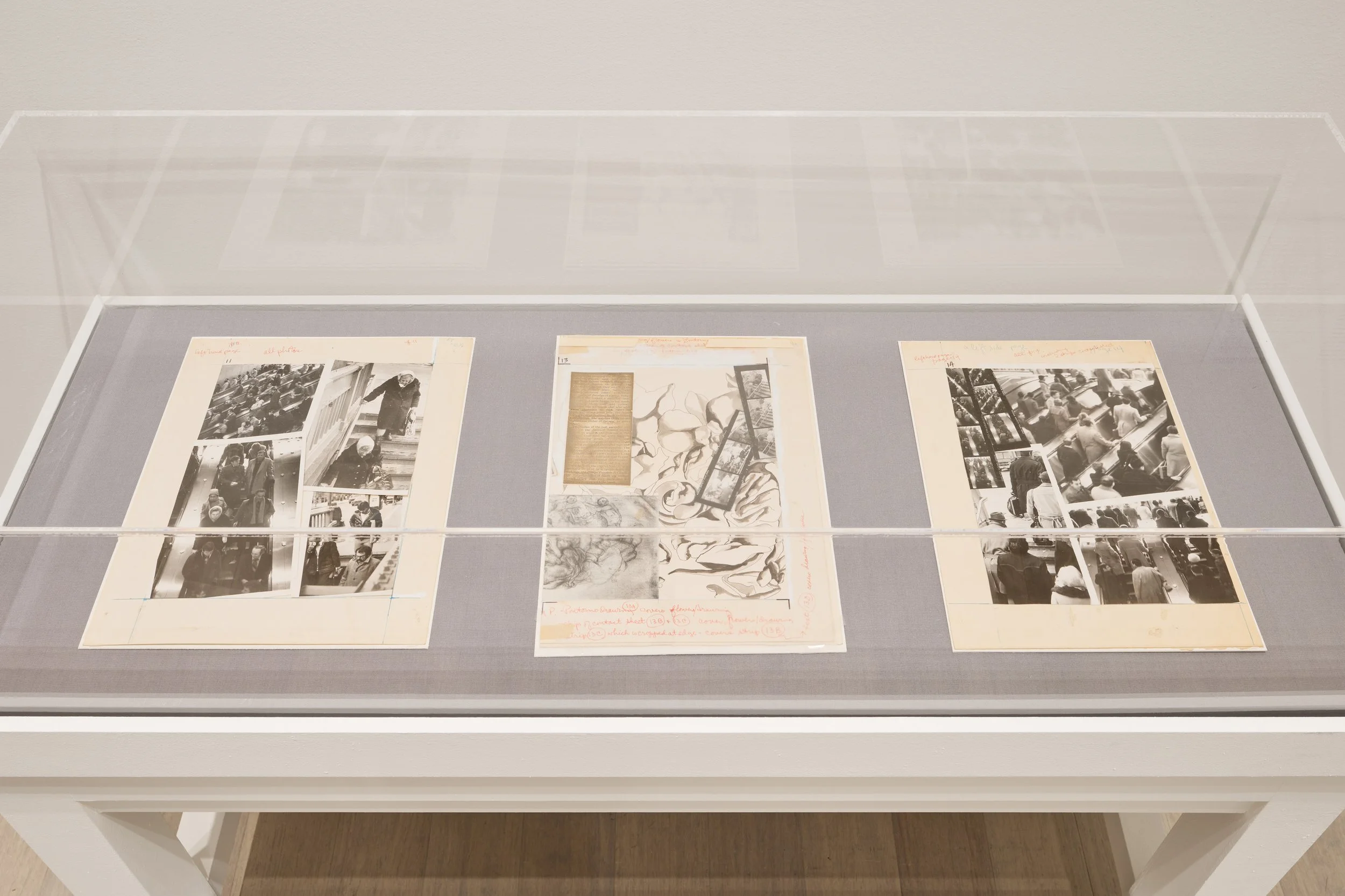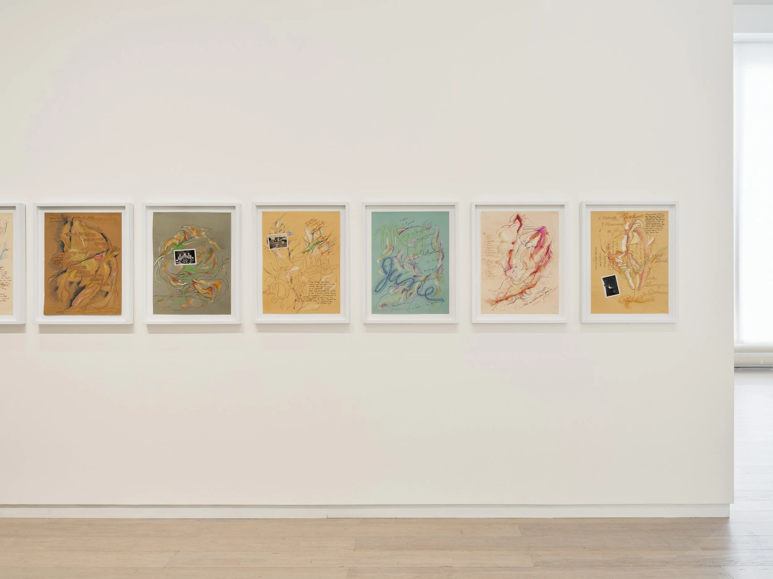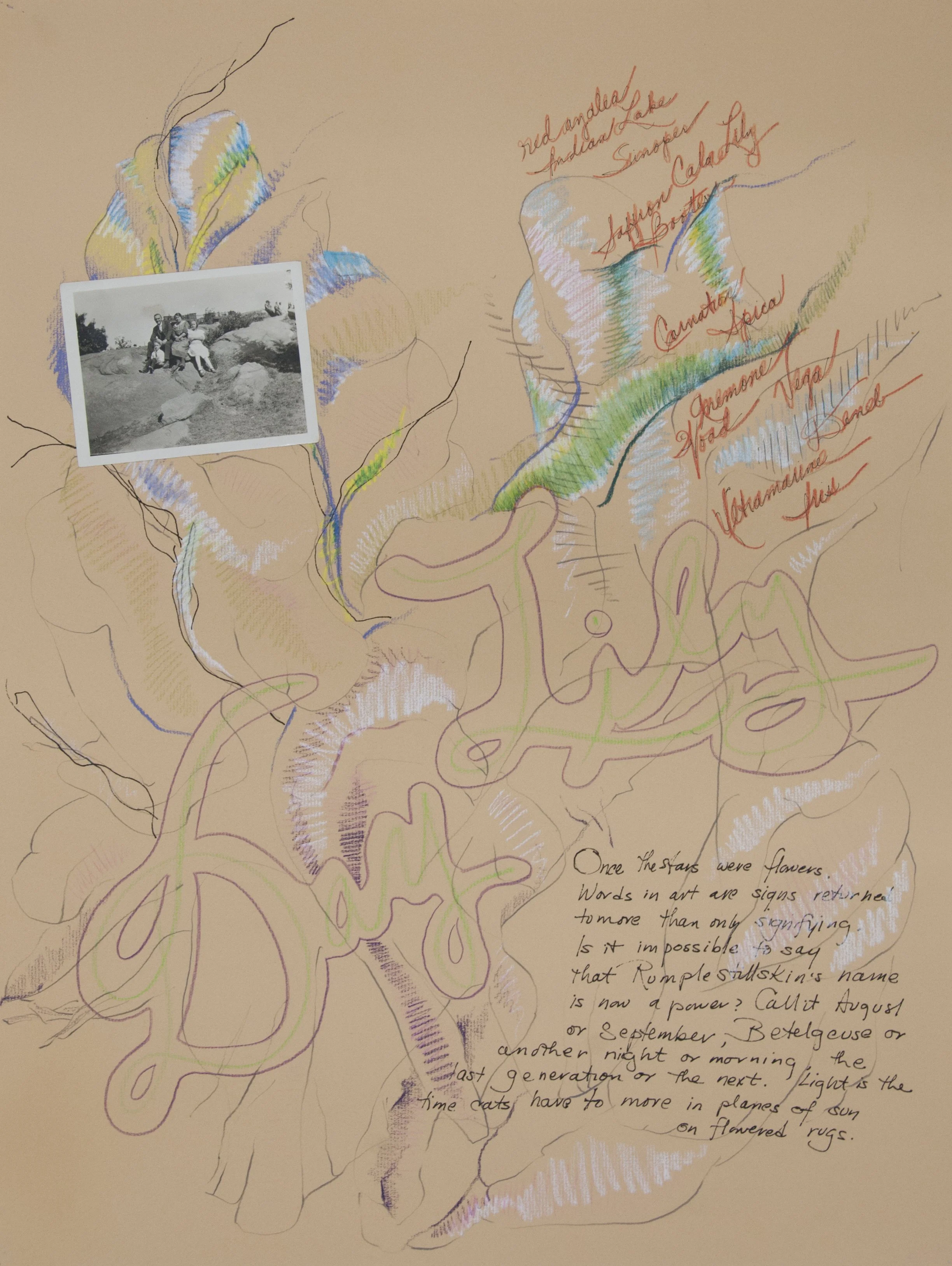 The exhibition title quotes a line from a drawing in the mixed-media series, In Time Order (1978). This poetic phrase captures the hybridity of the works in the exhibition and the temporal pulses of repetition and change that run throughout the exhibit. Fabric, flowers, and clouds symbolize the ephemeral and cyclical nature of time; they recur as formal motifs of temporal connections, weaving together historical and mythical figures, family history and biography, and past and present time.
